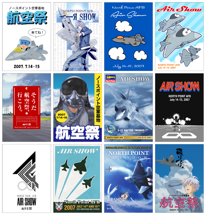 メビ隊による自作の航空祭ポスター一覧。誰作かは上記に対応。