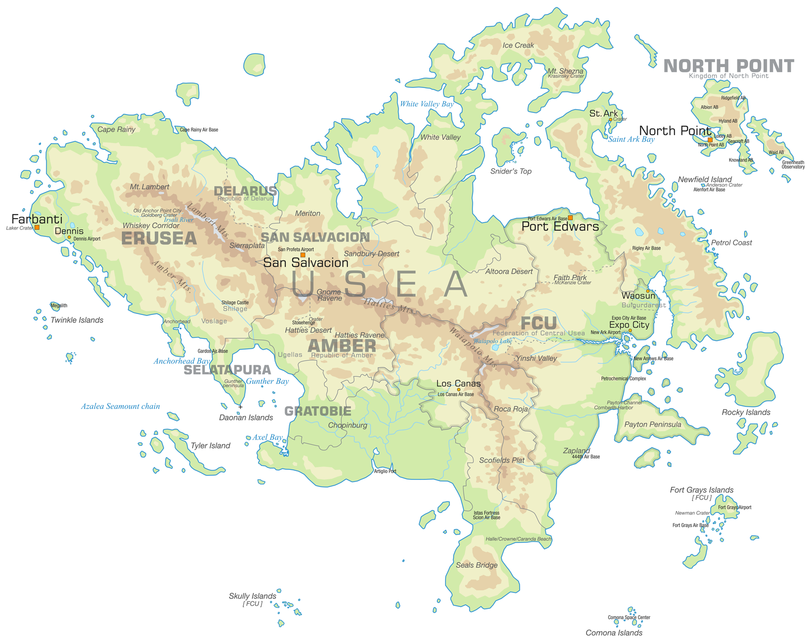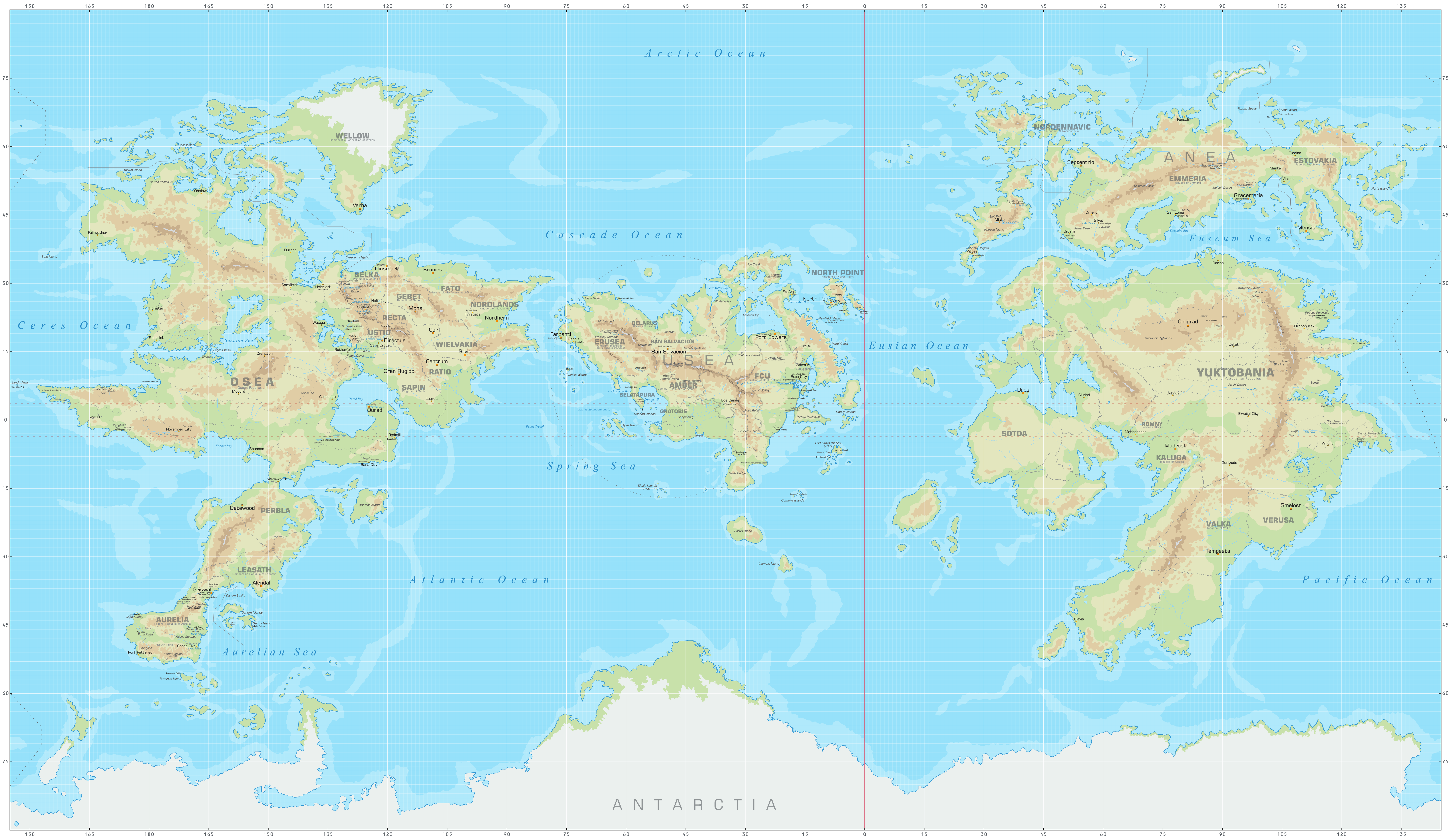ユージアの地形(色分け)は公式資料がありますが、他大陸は基本的に捏造です。詳細不明国や都市の配置も捏造。